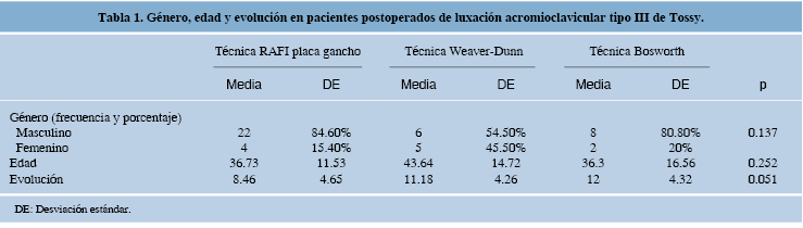 En el período de un año y cuatro meses se intervinieron 51 pacientes; se incluyeron 47, divididos en tres grupos según la técnica quirúrgica empleada: técnica RAFI placa gancho, 26 pacientes; técnica Weaver-Dunn, 11 pacientes; técnica de Bosworth, 10 pacientes. El sexo y la edad fueron similares en los tres grupos, con una p = 0.137 y p = 0.252, respectivamente. La evolución de la cirugía en la técnica RAFI placa gancho fue de 8.4 meses, en la técnica Weaver-Dunn, 11.18 meses y para la técnica de Bosworth, 12 meses, con una p = 0.051. (Tabla 1)