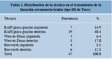En la distribución de la técnica, RAFI placa gancho derecha fue la más empleada, con 19 cirugías (40.4%), seguida de la técnica Weaver-Dunn derecha, con 8 (17%); la técnica quirúrgica menos utilizada fue Weaver-Dunn izquierda, con 3 cirugías (6.4%). (Tabla 2)