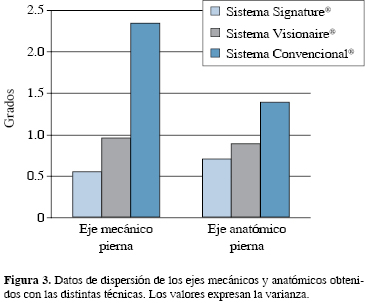 Analizando la precisión de las distintas técnicas, se observó una mayor precisión en el grupo intervenido con el sistema Signature® (variabilidad de 0.54o para el eje mecánico y 0.70o para el eje anatómico de la pierna), seguido de los pacientes intervenidos con el sistema Visionaire® (variabilidad de 0.95o para el eje mecánico y 0.90o para el eje anatómico de la pierna) y, en último lugar, los pacientes intervenidos con el sistema de alineación convencional (variabilidad de 2.35o para el eje mecánico y 1.38o para el eje anatómico de la pierna) (Figura 3).