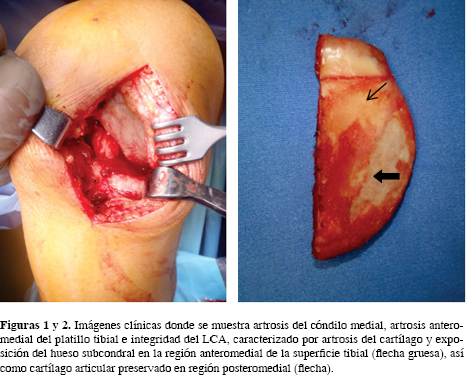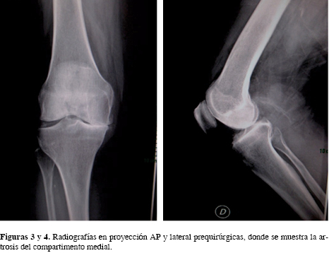 En todos los pacientes se realizó una cirugía con técnica mínima invasiva con un abordaje parapatelar medial a 3 cm por debajo de la línea articular; inmediatamente después de realizar la artrotomía se revisó el estado de la superficie articular y la integridad del LCA sin eversión de la patela y con resección de los osteofitos marginales similar a la descrita por Murray y colaboradores.10 Se empleó el mismo implante Oxford fase 3 con platillo móvil (Biomet Ltd, Bridgend, UK) y la misma técnica quirúrgica para la colocación del implante, así como un esquema similar de rehabilitación en cada uno de los casos.