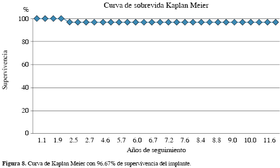 Se puede observar en nuestro estudio que no existen contraindicaciones por edad, peso o IMC del paciente; como ya muchos autores lo han referido previamente,34,35,36,37,38,39 el éxito de la artroplastía unicompartimental se basa en la correcta selección del paciente, no realizar hipercorrección del varo al momento de la cirugía, usar un adecuado tamaño de los componentes, contar con una adecuada estabilidad ligamentaria y así, evitar la progresión de la enfermedad en el compartimento lateral. La falla del implante se considera como retiro del mismo por cualquier causa y se muestra la curva de Kaplan Meier con supervivencia de 96.67% (Figura 8).