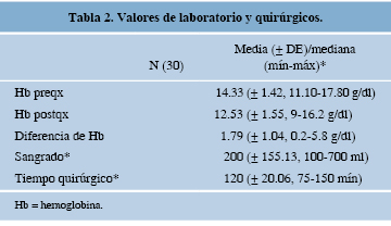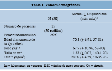 De los 25 pacientes estudiados (30 rodillas), 21 eran femeninos (84%) y cuatro masculinos; cinco pacientes fueron intervenidos de manera bilateral y en diferente tiempo quirúrgico; 14 rodillas eran derechas y 16 izquierdas. La media de edad al momento de la cirugía fue de 70.8 años (57-81 años), la media de peso, de 67.7 kg (52-90 kg), la media de talla, de 1.55 m (1.40-1.70 m) y el IMC de 28.09 kg/m2 (19-35.96 kg/m2) (Tabla 1). De acuerdo con los valores de laboratorio, la hemoglobina (Hb) prequirúrgica promedio fue de 14.3 g/dl (11.1-17.8 g/dl) y la Hb postquirúrgica, de 12.5 g/dl (9-16.2 g/dl). Al momento de la cirugía presentaron una mediana de sangrado de 200 ml (100-700 ml) y un tiempo quirúrgico con una mediana de 120 min (75 a 150 min) (Tabla 2). Se observó una disminución media de Hb de 1.79 g/dl (± 1.04 g/dl) en el postquirúrgico y sólo un paciente requirió la transfusión de un paquete globular en su estancia intrahospitalaria.