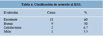 En los resultados obtenidos con el seguimiento a nuestros pacientes, se observa una óptima supervivencia del implante con una mejoría importante en las escalas clínicas y funcionales comparable y en ocasiones mejor a la reportada con el uso de prótesis total de rodilla.26,27,28 En nuestros casos reportamos un promedio postquirúrgico de flexión de 120o, el cual es superior a los reportes obtenidos con la artroplastía total de rodilla y -de acuerdo con los puntos obtenidos en el KSS- presentamos resultados similares a los descritos en la literatura, obteniendo 90% de resultados excelentes y buenos, 6.7% de resultados regulares por progresión de la osteoartrosis y 3.3% de resultados malos, que es únicamente un paciente tratado de un proceso infeccioso que requirió revisión del implante (Tabla 4).