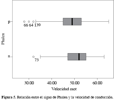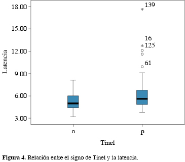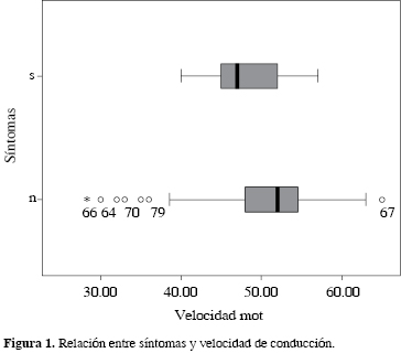 El estado clínico postoperatorio se correlaciona (p < 0'05) con la latencia y la velocidad de conducción motora prequirúrgicas. La media de la velocidad de conducción en los pacientes con persistencia de síntomas fue de 47.5 m/s, mientras que en los asintomáticos fue de 50.1 m/s (Figura 1). En el caso de la latencia, la media en pacientes con persistencia clínica fue de 6.5 m/s, mientras que en los pacientes asintomáticos fue de 5.5 m/s (Figura 2).