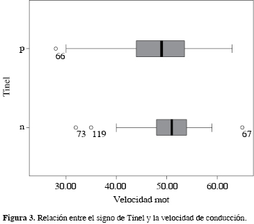 A todos los pacientes se les realizó un EMG, donde se obtuvieron los siguientes datos: latencia y velocidades de conducción motora y sensitiva. Se consideraron como velocidades normales cuando eran ≥ 45 m/seg y la latencia motora ≤ 4 m/seg.10