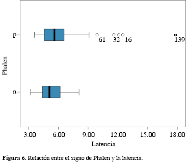 Respecto a los signos de Tinel y Phalen prequirúrgicos, aunque su presencia es más frecuente en los casos donde perduran los síntomas después de cirugía, no se encontró relación significativa. Por el contrario, sí hay correlación entre los signos de Tinel y Phalen y los estudios EMG, ya que en aquellos pacientes en los que existió positividad en los signos de Tinel y Phalen antes de la cirugía, las cifras de las EMG se encontraron con mayores alteraciones que en los pacientes donde estos signos clínicos fueron negativos (Figuras 3, 4, 5 y 6).