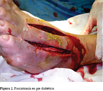Una vez que la úlcera se desarrolla, hay un alto riesgo de que su progresión lleve finalmente a la amputación. Se ha demostrado que la ulceración precede a la amputación por arriba de 85% de los casos,8 lo cual puede prevenirse si se adoptan las medidas pertinentes. El objetivo del presente trabajo es mostrar los resultados de un tratamiento que incluye, además de los métodos convencionales de administración de antibióticos, fasciotomías y debridación (Figura 2), la administración de pirofosfato de tiamina o cocarboxilasa, molécula que participa regulando muchas de las disfunciones que se presentan en la diabetes y sus complicaciones;9,10,11 también, porque se ha reportado que la diabetes se asocia a una deficiencia de tiamina.10