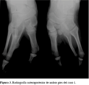En la radiografía simple de pies se observa la presencia de tres metatarsianos con fusión del tercero y cuarto del lado derecho. Desarrollo bilateral de falanges en el primer dedo y de los dedos quinto izquierdo y cuarto derecho (Figura 3).