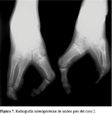 El examen físico evidenció sindactilia del cuarto y quinto dedos y hallux valgus severo bilateral (Figura 6). Radiológicamente, sólo hay tres metacarpianos y falanges en el primero y quinto dedos en ambos lados (Figura 7).