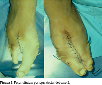 En el postoperatorio se colocaron cinchas metatarsales durante un mes. No hubo complicaciones en el período postoperatorio. Esta paciente se mantuvo en observación por dos años, sin evidencia de complicaciones o recidivas. Desde el punto de vista mecánico y funcional, los pies permiten el uso de calzado común sin dolor o limitaciones para la marcha (Figura 5). El resultado final se calificó como bueno (nueve puntos según la escala de Tani y colaboradores).