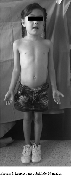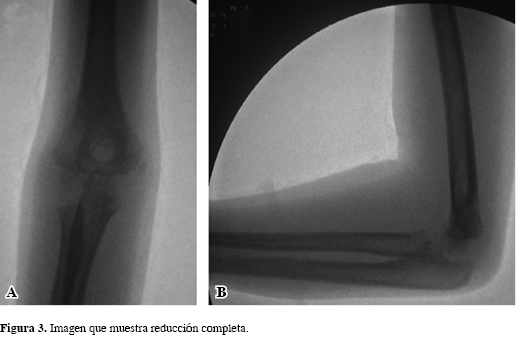 Se trata de una niña de cinco años de edad, previamente sana y sin antecedentes quirúrgicos ni traumáticos de ningún tipo, quien cayó desde una altura de 1.5 m, recibiendo un trauma directo en el miembro superior derecho con el codo en flexión y contusión por el cuerpo con posterior edema dolor y deformidad del codo derecho. Consultó al Servicio de Urgencias de nuestro hospital, presentando al ingreso edema en la región del codo derecho con equimosis localizada, deformidad y dolor sin déficit neurovascular distal. Se tomaron radiografías (Figura 1 A-C), donde se observó una luxación del codo derecho asociado con fractura del epicóndilo lateral. Consideramos realizar un manejo quirúrgico, con reducción cerrada fijación percutánea con clavos de Kirschner (Figura 2 A y B), llevada a cabo sin complicaciones (Figura 3). La paciente egresó con plan de fisioterapia y seguimiento con controles periódicos y al cabo de dos meses se encontró con resultados satisfactorios, con rangos de movilidad conservados con ligero cúbito en varo de 14 grados, el cual ha venido mejorando. Por todo lo anterior, consideramos que es un resultado postoperatorio satisfactorio con buenos resultados funcionales (Figuras 4 y 5).