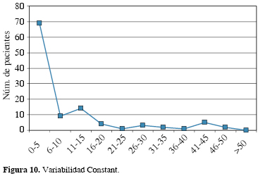 Los cambios funcionales de las extremidades afectadas y las extremidades sanas se correlacionaron con la variabilidad en las escalas. De acuerdo con el rango de porcentaje de variabilidad se obtuvieron los resultados. En caso del DASH la variabilidad pre- y post- fue mayor de 0-10% con 49 pacientes, disminuyendo de forma progresiva. En el caso del Constant score no existió variabilidad mayor de 50%, coincidiendo con la escala previa en el porcentaje de mayor variabilidad 0-5% con 69 pacientes y observando la misma tendencia en la disminución de las cifras (Figuras 9 y 10).