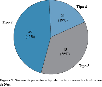 De acuerdo con la clasificación de Neer 19% (21) era tipo 4, 36% (40) tipo 3 y 45% (49) tipo 2; mientras que con la clasificación AO 56% (62) fueron tipo A, 29% (32) tipo B y 15% (16) tipo C (Figuras 5 y 6).