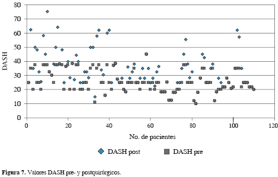 Como base, los pacientes presentaron una función en la escala de DASH de 0 a 30 antes de la lesión o en la extremidad no afectada. El cambio mínimo con valor estadístico significativo fue de 30 puntos, mientras que la diferencia mínima clínica para ser estadísticamente significativa es de 20 puntos.