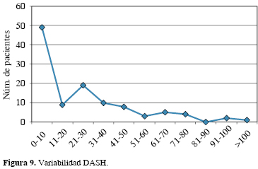 La segunda escala utilizada, el DASH (Disabilities of the Arm, Shoulder and Hand),28 cumple con la misma función que la escala previa; sin embargo, ésta es una evaluación que se realiza a partir del punto de vista del paciente. La descripción de esta escala involucra las articulaciones de toda la extremidad y valora su función en tareas usuales de todos los pacientes. Ha demostrado ser la herramienta más útil para establecer una adecuada correlación bimecánica, patológica y funcional de la extremidad. Normalmente un DASH menor de 20 puntos es considerado bueno y uno mayor de 40 puntos es regular a malo como lo demostró Hudak en la valoración clínica de dicha escala.29 En los pacientes con cierta limitación previa, se considera un buen resultado menor de 30 puntos y malo mayor de 45 puntos.