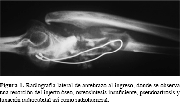 Su diagnóstico de ingreso fue seudoartrosis infectada de cúbito izquierdo (Figuras 1 y 2).
