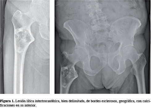 El fibromixoma lipoesclerosante óseo (TFMLE) es una neoplasia benigna fibroósea de reciente descripción que tiene una predilección por la región intertrocantérica del fémur; se presenta entre la segunda y séptima década de vida, con una media de 40 años.1,2 Habitualmente es un hallazgo incidental en pacientes asintomáticos o puede estar asociado a fractura hasta en 10% de los casos.1 El aspecto radiológico es de una lesión lítica, geográfica, bien delimitada, con bordes esclerosos con calcificaciones en el interior, sin reacción perióstica (Figura 1) Se caracteriza por una mezcla de elementos histológicos fibroóseos, necrosis grasa e infarto óseo.1,3,4 Entre 10 y 16% puede sufrir transformación sarcomatosa.