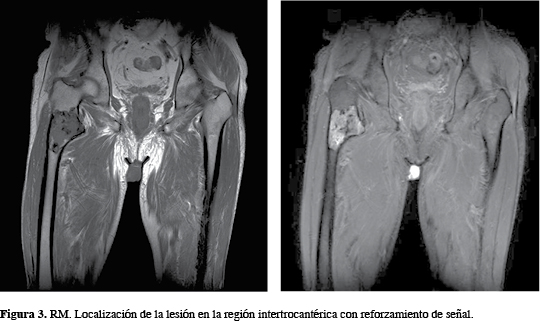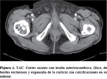 Masculino de 80 años de edad, sin antecedentes de importancia para su padecimiento actual, que inició desde Noviembre de 2010 con coxalgia derecha, con disminución del dolor a la ingesta de AINE. Evolucionó con dolor continuo e incremento de la intensidad hasta llegar a la incapacidad funcional de la extremidad pélvica afectada. Inicialmente fue manejado en otra institución, donde se le realizó biopsia, con reporte de osteonecrosis, médula ósea grasa, fibrosis y calcificaciones. Se envió al Hospital de Ortopedia "Dr. Victorio de la Fuente Narváez", IMSS, al Servicio de Cirugía de Tumores Músculo-Esqueléticos en Febrero del 2011. A la exploración física dirigida de la extremidad pélvica derecha, se observó una cicatriz de biopsia previa a nivel lateral del muslo proximal derecho, sin alteraciones de la superficie cutánea ni aumento de volumen; presentaba arcos de movilidad de cadera y rodilla conservados, dolorosos en sus últimos grados. Estudios paraclínicos normales. Las radiografías mostraron una zona lítica en la región intertrocantérica derecha, de 6 x 3 cm, geográfica, con bordes esclerosos, calcificaciones aisladas en su interior, con la cortical íntegra, sin reacción perióstica ni datos de afección a tejidos blandos (Figura 1). Los cortes axiales de la tomografía axial computarizada evidenciaron lesión lítica, bien delimitada, con calcificaciones en su interior y dilataba al fémur proximal (Figura 2). El estudio de resonancia magnética hizo patente una lesión con bordes escleróticos bien marcados, con señal baja en T1 y señal alta en T2, sin ruptura de la cortical, sin afección a tejidos blandos (Figura 3).