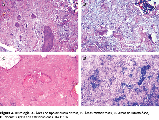 Se llevó a cabo la resección tumoral con legrado exhaustivo de la cavidad y posteriormente se colocó polimetilmetacrilato, dejando la cavidad adecuadamente ocluida. Se obtuvo un material macroscópicamente de color blanquecino, denso y fibroso. Por patología, se reportó un tejido calcificado abundante con extensión hacia el canal medular femoral, sin evidencias de malignidad, con el diagnóstico histopatológico definitivo de fibromixoma lipoesclerosante óseo (TFMLE) con base en las características histológicas, consistentes con áreas de tipo displasia fibrosa, infarto óseo con calcificación distrófica, necrosis grasa, fibrosis y cambios mixoides (Figura 4).