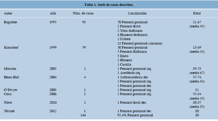 Desde la descripción original de la lesión, pocos casos se han agregado a la literatura mundial. Se destacan dos grandes series: Ragsdale (1993)7 y Kransdorf (1999),9 con 95 y 39 casos, respectivamente. La literatura mundial define a esta lesión dentro de un rango de edad de los 15 a los 75 años de edad, con una mediana de 50 años. El caso presentado rebasa por cinco años la edad más alta de los casos descritos en la literatura (80 años de edad). Hasta el momento sólo encontramos 145 casos en la bibliografía consultada. De las lesiones, 92.4% se presentan en la región del fémur proximal y de ésta, la localización intertrocantérica es la más frecuente. La diáfisis del húmero, diáfisis de la tibia, el cráneo, el ilíaco y las costillas son otros huesos en donde se ha descrito, pero sólo representan 7.6% de todos los casos. Nosotros contribuimos a la literatura con un caso de un paciente masculino de 80 años de edad con una lesión clásica de esta entidad en la región intertrocantérica derecha, cuyas características clínicas, radiográficas e histológicas son acordes con lo reportado en la literatura mundial (Tabla 1).