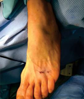 El paciente se colocó en decúbito supino bajo anestesia regional del pie y control por medio de fluoroscopio; se realizó primero la sección del ligamento intermetatarsiano con una hoja de bisturí 67 MIS, mediante una incisión longitudinal en el espacio intermetatarsiano a nivel del cuello (Figura 2), apoyándose sobre el cuarto metatarsiano, deslizándose sobre la cortical lateral con dirección inclinada de proximal hacia distal, se profundizó con la parte cortante hacia los dedos y con un movimiento de abajo hacia arriba se seccionó el ligamento intermetatarsiano transverso, percibiéndose el corte debido a la resistencia que se produjo en dicho acto.