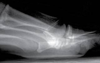 El segundo gesto quirúrgico consistió en hacer osteotomías del tercer o cuarto metatarsiano usando dos incisiones a nivel del cuello, con la misma hoja de bisturí y a nivel del pliegue interdigital dorsal; con una raspa pequeña se disecó el periostio de la cara lateral del cuello del tercer metatarsiano y se hizo un canal a la vez; posteriormente, se introdujo una fresa Isham larga o Shanon 44 larga con una inclinación de 45º, se inició la osteotomía con una dirección oblicua de distal dorsal a plantar proximal (Figura 3). La osteotomía del cuarto metatarsiano se realizó de la misma forma. Se suturaron las heridas con nylon 3-0, se colocó un vendaje con gasas interdigitales de lateral a medial del segundo, tercer y cuarto espacios para estabilizar las articulaciones metatarsofalángicas; para finalizar, se puso un zapato postquirúrgico de suela rígida, que permitía el apoyo inmediato sin asistencia.