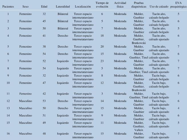 Nuestra población estuvo conformada por 68.75% de mujeres y 31.25% de hombres, con una proporción 2.2:1, con una media de edad de 46.12, con un rango entre 32 y 54 años. En 18.75% se presentó de forma bilateral, 50% izquierdo y 31.25% derecho. El tiempo promedio de evolución de la patología previamente a la cirugía fue de 11.6 meses, con rango entre tres y 23. Cien por ciento de los pacientes tuvieron el neuroma en el tercer espacio intermetatarsiano y 100% realizaba una actividad física moderada; 50% usaba tacón alto y 50% tacón bajo, 62.50% utilizaba calzado ajustado y 37.50% calzado holgado. Las pruebas de Mulder y de Gauthier estuvieron presentes en 100% de los pacientes, Bratowski en 12.5%, Tinel en 18.75% y Valleix en 6.25%.