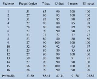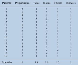 Con respecto al dolor (EVA), se encontró que antes de la cirugía fue de 6/10; a los siete días, de 2/10; a los 15 días, de 2/10; a los seis meses, de 1/10 y a los 18 meses, de 1/10 (Tabla 2). Con el programa SPSS®, se realizó la prueba de normalidad con Shapiro-Wilk por ser una muestra menor a 30, en donde el dolor, tanto prequirúrgico como postquirúrgico, se encontró por arriba de un valor p > 0.05. Posteriormente, se aplicó la T de Student para muestras relacionadas, con la cual se identificó un valor p < 0.05 (Tabla 3).