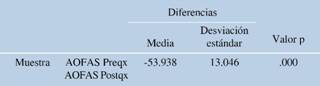 Se evaluó la función con la American Orthopaedic Foot and Ankle Society (AOFAS), con un promedio de funcionalidad basado en la escala con máximo de 100 puntos, previo a la cirugía, de 33.5; a los siete días, de 85.44; a los 15 días, de 87.44; a los seis meses, de 91.38 y a los 18 meses, de 92.88 (Tabla 4). Con el programa SPSS®, se realizó la prueba de normalidad con Shapiro-Wilk por ser una muestra menor a 30, en donde la funcionalidad, tanto prequirúrgica como postquirúrgica, se encontró por arriba de un valor p > 0.05. Posteriormente, se aplicó la T de Student para muestras relacionadas, con la cual se identificó un valor p < 0.05 (Tabla 5).