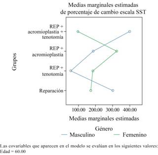 Por último, en el análisis multivariado para el porcentaje de cambio en la escala SST, según los grupos de tratamiento y el género de los pacientes manteniendo la edad bajo control con el análisis de covarianza (Figura 3), hay una tendencia a una interacción tratamiento-género, puesto que en los grupos de RAMR (p = 0.32) y RAMR+ TBA (p = 0.19) los hombres mostraron una mejoría significativa en la función del hombro comparado con las mujeres, pero en los grupos de RAMR + TB (p = 0.32) y RAMR + A (p = 0.37) los efectos fueron contrarios, pues las mujeres tuvieron una mejoría significativa de la función del hombro en comparación con los hombres.