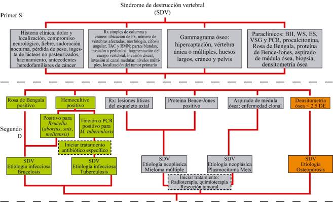 La patología de la columna vertebral, ya sea infecciosa, tumoral o metabólica, se manifiesta con presentaciones clínicas y radiológicas muy diversas, lo que en ocasiones puede confundir el diagnóstico etiológico. El síndrome de destrucción vertebral engloba situaciones de etiología múltiple; se caracteriza por alteraciones en la anatomía de la columna, que se acompañan de dolor e incapacidad funcional por alteraciones mecánicas y neurológicas. En el síndrome de destrucción vertebral se pueden utilizar una serie de pasos diagnósticos que analizan de manera ordenada y sistemática las diferentes causas que podrían estar afectando al paciente. Las patologías que causan el síndrome de destrucción vertebral poseen características comunes entre sí, ampliamente descritas; sin embargo, para la identificación del síndrome es necesario considerar las singularidades que estas morbilidades comparten, a fin de realizar un proceso que permita la sistematización en el abordaje. De esta manera, podría optimizarse el tiempo entre la identificación de la patología y el inicio del tratamiento pertinente, además de proponerse los estudios de gabinete más sensibles y específicos para cada entidad nosológica, conociendo su valor predictivo positivo. En conclusión, no olvidemos sistematizar nuestro pensamiento diagnóstico y no saltarnos ningún paso, ya que esto provoca diagnósticos falsos positivos, lo cual repercute en la calidad de la atención médica.