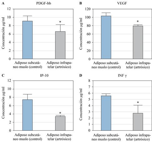 Figura 1: Análisis cuantitativo de factores solubles de células mesenquimales aisladas de grasa de Hoffa y tejido adiposo subcutáneo de pacientes con artrosis grave de rodilla (p < 0.05).