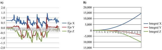Figura 1: A) Gráfica obtenida con Pivot Shift Meter previo al cálculo de las integrales de cada eje de movimiento. B) Gráfica obtenida tras el cálculo de las integrales de cada eje de movimiento.