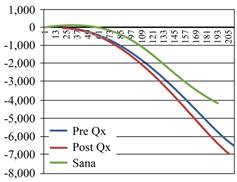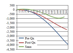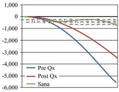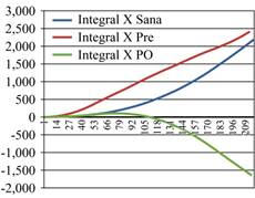 Figura 5: Integrales del eje «Y» obtenidas en un paciente PO bajo técnica de Un Haz. Se observa una similitud entre las líneas pre- y post Qs; sin embargo, existe una mayor distancia entre la sana y la postoperada.