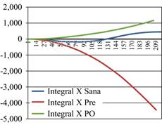 En cuanto a los valores de Y, tenemos que la integral obtenida al medir la pierna sana fue de -4,149.43 m/s, contra la rodilla lesionada previo a la anestesia que resultó en -6,528.78 m/s. Posteriormente se obtuvo un valor de -6,973.85 m/s tras la reconstrucción del LCA mediante la técnica de Un Haz (Figura 4). En la integral de Y en un paciente con reconstrucción mediante U-Dos, obtuvimos -2,760.09 m/s en la rodilla sana y -6,470.80 m/s en el preoperatorio, mientras que en el postoperatorio se obtuvo -4,670.07 m/s (Figura 5).