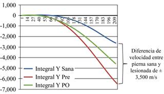 Figura 4: Ejemplo de un paciente cuya integral del eje «Y» muestra diferencia de velocidad en ACM de ± 3,500 m/s entre la pierna sana y la lesionada en comparación con la PO que es menor a 2,500 m/s. Técnica de reconstrucción de U-Dos.
