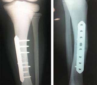 Se le efectuó una reducción abierta y fijación interna con placa de compresión de bloqueo (LCP) a tibia izquierda sin complicaciones transquirúrgicas, con buena evolución clínica, realizándose controles radiográficos mensualmente; inició su apoyo a los tres meses posterior al evento quirúrgico (Figura 3), primero asistido con muletas un mes y posteriormente con bastón. Se dio de alta por mejoría a los cinco meses con cita a control y vigilancia al año posterior al trauma, se encontró consolidación grado IV de Montoya y se citó en dos años para retiro de la placa dada las características propias de la enfermedad y la osteoesclerosis de los huesos.