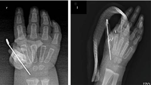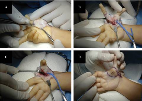 Subsequently, a section was made through the distal physis of the 1st radial metacarpal to perform a carpometacarpal arthrotomy and ablation of the first metacarpal and the second radial finger, maintaining the reduction in hyperextension of the metacarpal head and fixation with 0.35 K-wire, making the fixation of metacarpal to the distal carpus with 4-0 nylon suture.