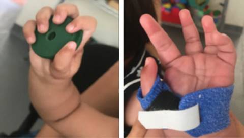 Occupational therapy facilitated recruitment of muscle fibers for fine and thick grasps and scopes. Activities for encouraging grasp pattern include tearing up paper, picking up pencils, opening containers, playing with small objects (cars, coins and blocks), coloring/scribbling and pulling apart sticker, obtaining excellent response for the flexor pollicis longus. We continued with a splint to improve the position of the thumb in the carpometacarpal joint, and with occupational therapy, favoring a thick and fine grasp for 1 year (Figure 5).