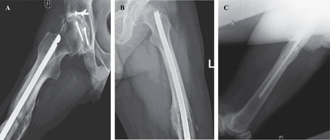 Paciente 2: varón de 48 años con dolor crónico en cadera izquierda. Antecedente de fractura diafisaria de fémur intervenida a los 21 años de edad. Los rayos X confirman la consolidación de la fractura y con clavo IM clase Küntscher sin tornillos de bloqueo (Figura 1B).