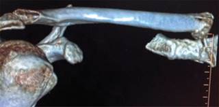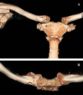 Figura 2: Reconstrucción 3D de tomografía axial computarizada de clavícula. Demostrando luxación anterior de articulación esternoclavicular derecha.