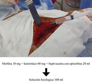 Esta investigación fue aprobada por el comité de ética en ciencias de la salud de nuestra institución. Se obtuvo un consentimiento informado de cada paciente antes de la cirugía. Se realizó un ensayo clínico comparativo, prospectivo y simple ciego. Se incluyeron pacientes tratados con reemplazo total de cadera electivo secundario a artrosis degenerativa de Enero de 2019 a Enero de 2020. Se evaluaron dos grupos: infiltración periarticular (IPA) (Figura 1) y bloqueo nervioso del plexo lumbar (BNPL) (Figura 2), ambos como parte de un protocolo de manejo multimodal del dolor. Se excluyeron los pacientes con artroplastía por fracturas, tumores, necrosis ósea avascular, consumo crónico de opioides (más de tres veces al día en los últimos cinco meses), abuso de alcohol y/o drogas, úlceras gastroduodenales activas, antecedentes de sangrado gastrointestinal, insuficiencia renal crónica y alergia a los medicamentos del estudio. Además, se excluyó a todos los pacientes con comorbilidades que pudieran afectar nuestros resultados finales como fibromialgia o neuropatía diabética.
