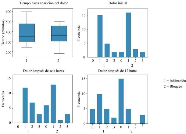 El protocolo analgésico utilizado no se asoció con el dolor al inicio de la recuperación (p = 0.47); la mayoría de los pacientes refirieron dolor leve a moderado. El tiempo hasta la aparición del dolor fue de 373 minutos promedio en ambos grupos (p = 0.98) ( Figura 4, esquina superior izquierda). El grupo del bloqueo tuvo una mejor escala de dolor después de seis y 12 horas de la cirugía (p = 0.015 y p = 0.008, respectivamente) (Figura 4).