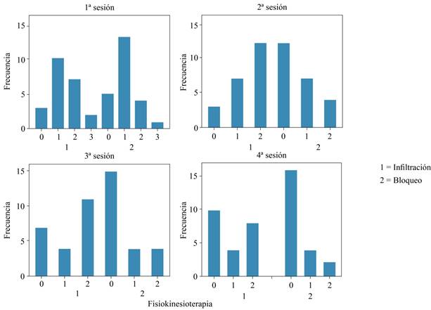 En cuanto al dolor con la fisioterapia, ambos grupos refirieron dolor leve (p = 0.57) con la primera sesión; sin embargo, en las siguientes sesiones (segunda, tercera, cuarta) el grupo del BNPL presentó menor dolor (p = 0.009; 0.04 y 0.016, respectivamente). De los pacientes asignados a bloqueo del plexo lumbar, 50% no reportaron dolor (Figura 5).
