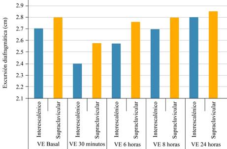 Excursión diafragmática von ventilación profunda: se midió el valor basal a los 30 minutos, a las seis, ocho y 24 horas, reportando medias y desviación estándar para cada grupo. La excursión diafragmática en ventilación profunda basal del grupo 1 tuvo una media de 6.07 ± 0.29 cm y del grupo 2 de 6.0 ± 0.33 cm. A los 30 minutos en el grupo 1 media de 5.9 ± 0.32 cm y de 5.88 ± 0.34 cm en el grupo 2. A las seis horas: grupo 1 con una media de 5.6 ± 0.32 cm y una media de 6.09 ± 0.34 cm en el grupo 2. A las ocho horas: grupo 1 media de 6.22 ± 0.30 cm y en el grupo 2 de 6.21 ± 0.31 cm. A las 24 horas: grupo 1 con una media de 6.3 ± 0.32 cm y en el grupo 2 con media de 6.29 ± 0.33 cm, con una diferencia estadística significativa (p = 0.01).