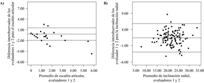Figura 2: Gráficos de Bland-Altman ilustrando la reproducibilidad interobservador de los promedios de las dos mediciones del evaluador 1 y 2 para el escalón articular A) y la inclinación radial B); las líneas centrales representan la media de las diferencias entre los evaluadores, y las líneas superiores e inferiores los límites a ± 2 desviaciones estándar de la media.