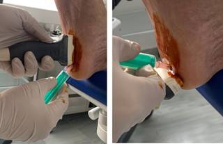 Una vez colocada la aguja, el ayudante activa la maniobra de Windlass (haciendo flexión dorsal de los dedos) y realiza la fasciotomía longitudinal con la aguja en sentido proximal. Esto último se repite hasta lograr disminución de la resistencia de los tejidos (Figura 2).