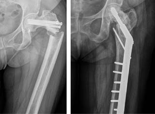 La fractura subtrocantérica se produce dentro de los primeros meses tras la fijación con tornillos, por lo que existe una clara relación de causa-efecto con dicha cirugía previa.