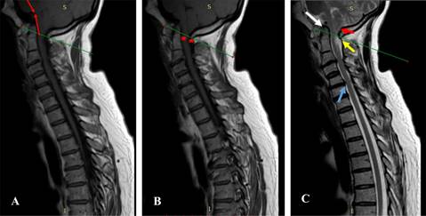 Figura 3: A) Corte sagital de resonancia magnética nuclear de columna (RMNC), proyección T1, en línea roja, ángulo pontomedular, no muestra kicking; línea verde, plano de McRae. B) RMNC, en T1, corte sagital; en asteriscos rojos, espacios libres de unión bulbo medular, se muestra espacio canal raquídeo sin compresión. C) RMNC en T2, corte sagital; flecha blanca, aparato cruciforme abombado, evidencia de hiperlaxitud; flecha roja, amígdalas cerebelosas, sin descenso; flecha amarilla, hiperintensidad en cordón posterior; flecha celeste, abombamiento del ligamento longitudinal posterior por protrusión discal contacta con la médula, pero no hay datos clínicos de mielopatía.