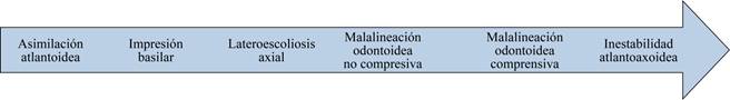 | Deformidad | Cuello corto (CC) Pérdida de la lordosis cervical Subluxación atlantoaxoidea (SAA) MO no compresiva/compresiva IAA leve(6) |
